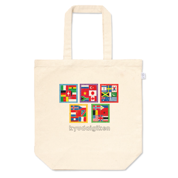 ひばりこども園」の園児たちによる五大陸をイメージした塗り絵アートをトートバッグにしました。世界中の国旗が描かれたカラフルなトートバッグです。